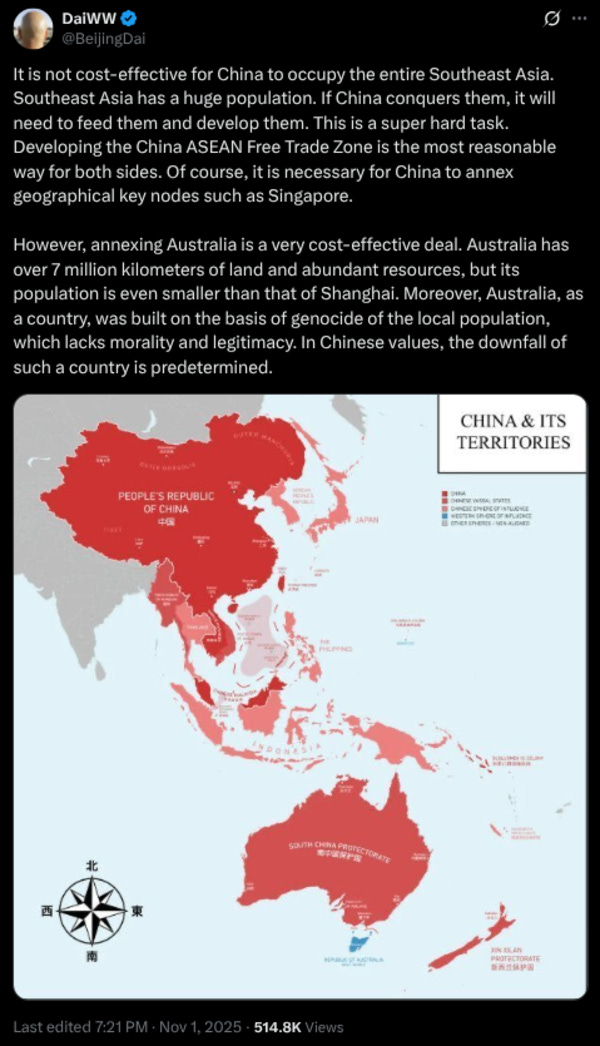 A Chinese propagandist has publicly called for the annexation of Australia. Not joking. Not hinting. He laid it out in detail, with a map and everything. Australia, he said, should be conquered because we’re rich in resources, thinly populated, and easy to control. His words, not mine.