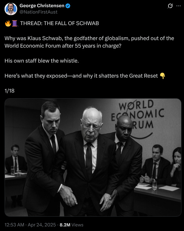 Klaus Schwab’s downfall is so complete, so total, and so grotesque in its detail that it reads like satire. But it’s all real. Nation First covered the early whistleblower revelations back in April, our epic X thread was viewed by over 8 million people and shared 20,000 times, including by General Michael Flynn. (Click here or below to check out that thread… don’t miss the cheeky AI image on post 3!)